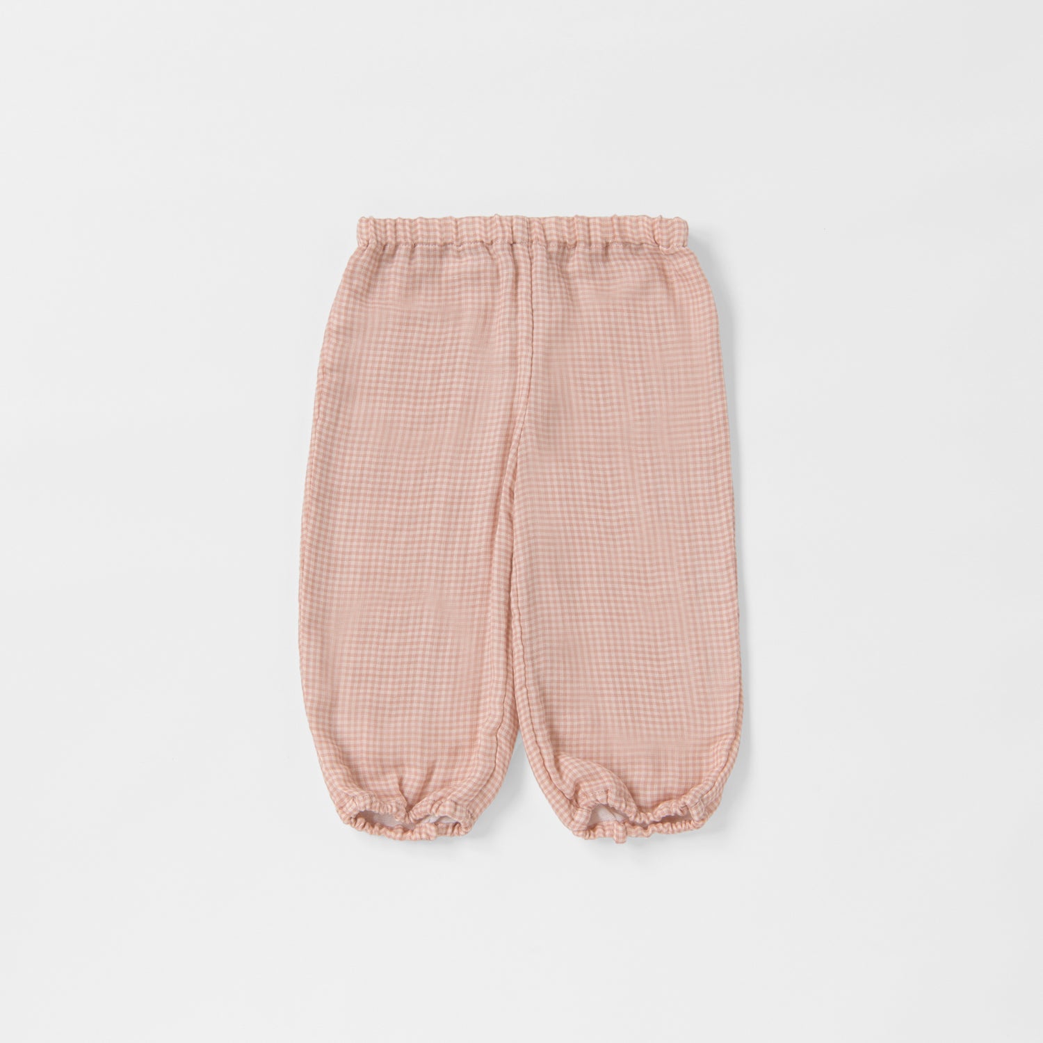 ゆったりとした形で、袖口、足首にゴムが入っています。履き口はゴム口から調節が可能です。