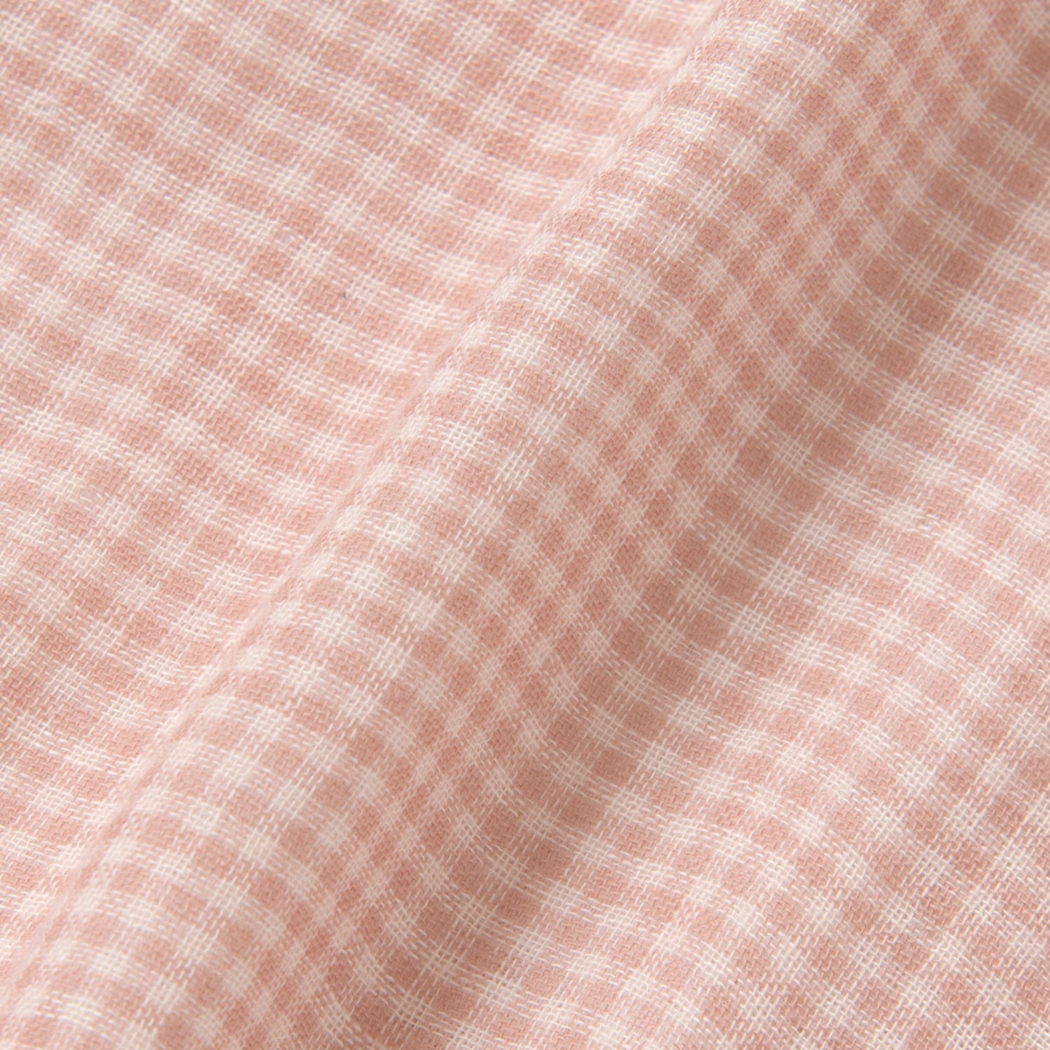 現在は生産されていない石川県金沢市の低速織機を使い、久留米絣の産地で知られる福岡県筑後市で織り上げています。繊維の短いやわらかな綿糸を使用し、糸が切れないようゆっくりと丁寧に織り上げることで軽くやわらかなオリジナルガーゼ素材に仕上がりました。 ピージーガーゼの定番ガーゼ生地で、洗うほどに空気を含みふわふわとやさしい風合いに変化します。