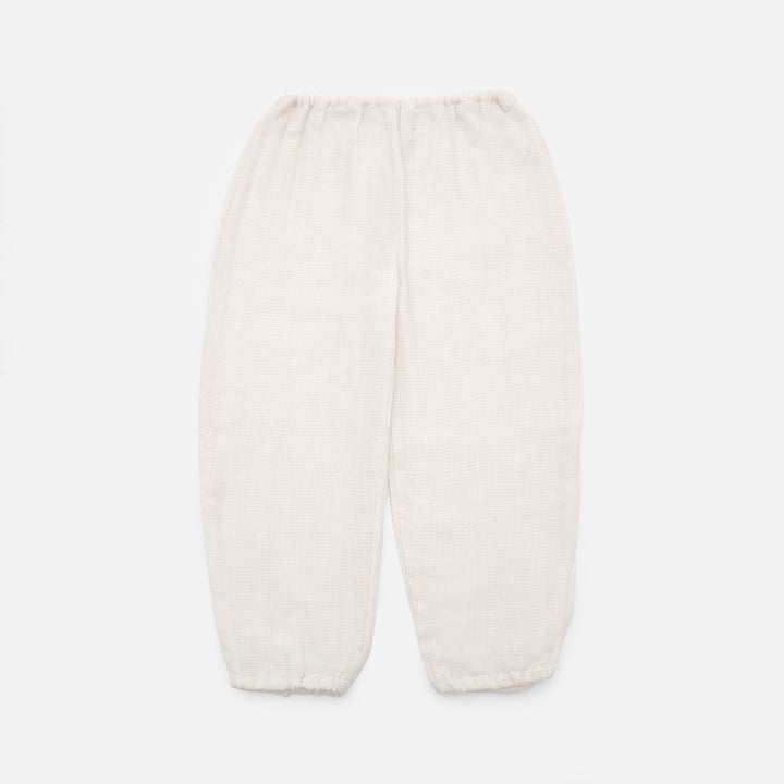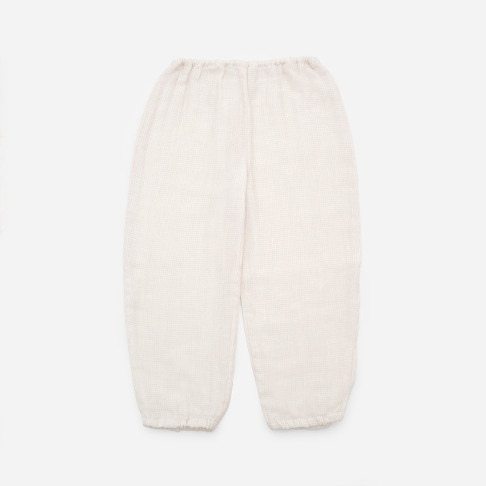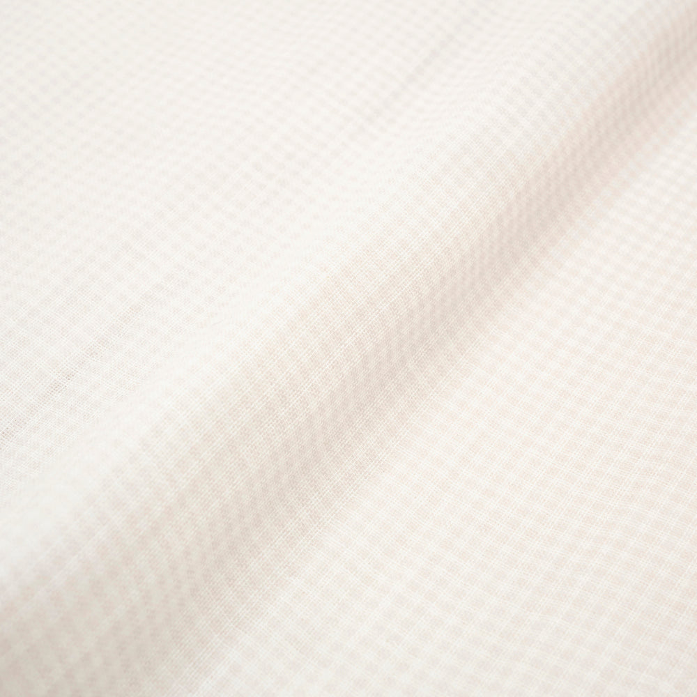 現在は生産されていない石川県金沢市の低速織機を使い、久留米絣の産地で知られる福岡県筑後市で織り上げています。繊維の短いやわらかな綿糸を使用し、糸が切れないようゆっくりと丁寧に織り上げることで軽くやわらかなオリジナルガーゼ素材に仕上がりました。 ピージーガーゼの定番ガーゼ生地で、洗うほどに空気を含みふわふわとやさしい風合いに変化します。