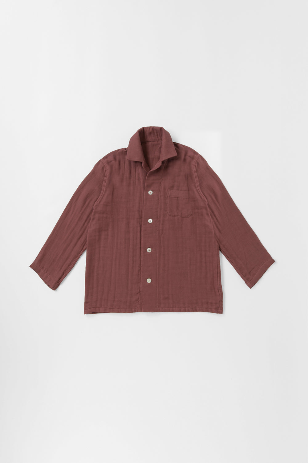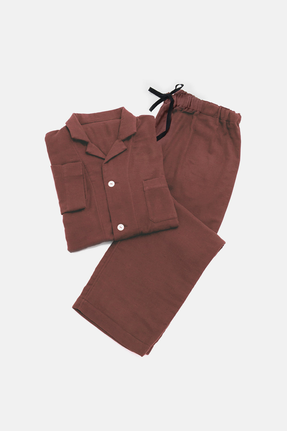 腕まわりのゆったりとしたメンズパジャマ。 第1ボタンは閉じるとあたたかく、開くとオープンカラーとして使用できます。