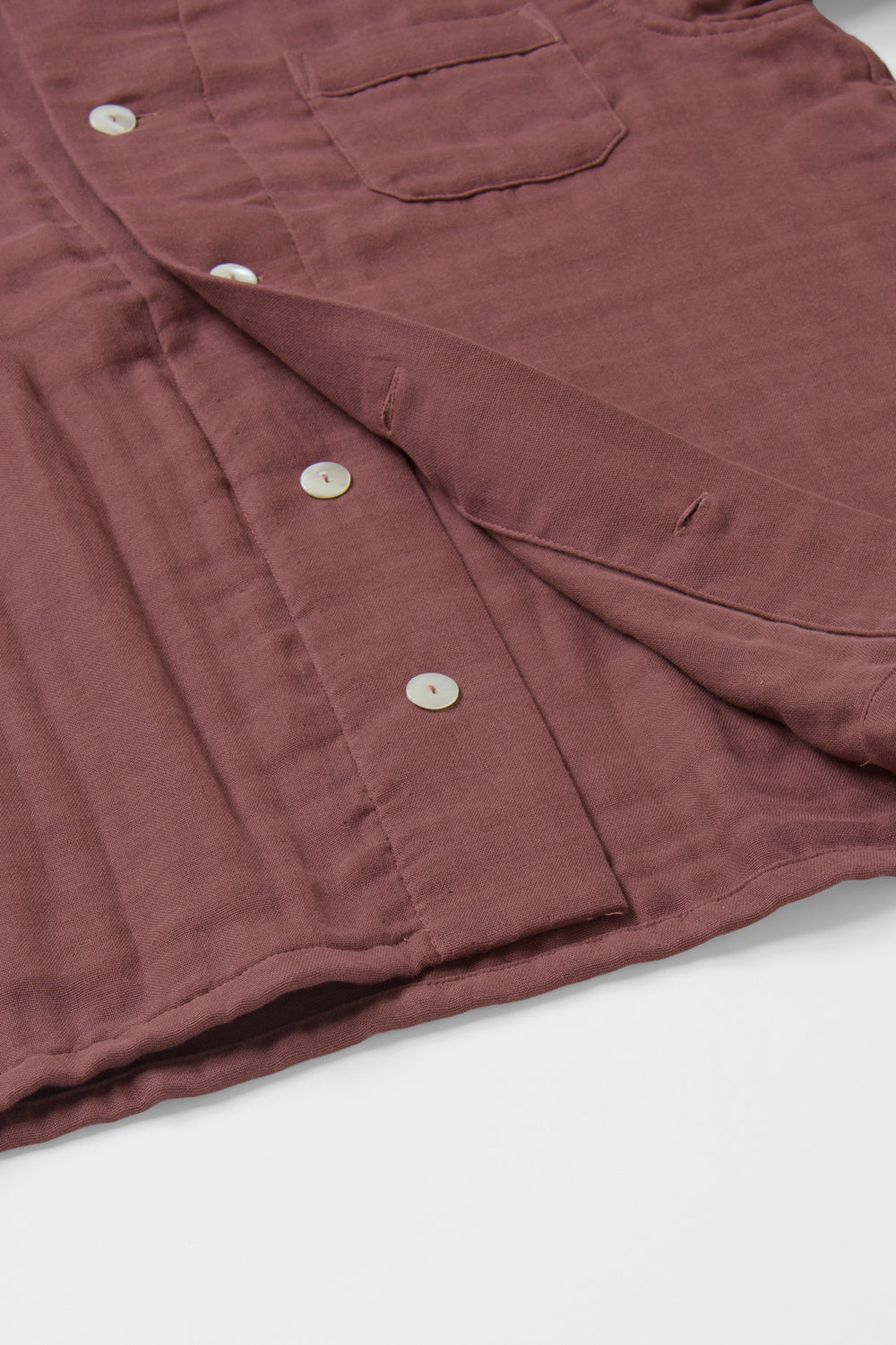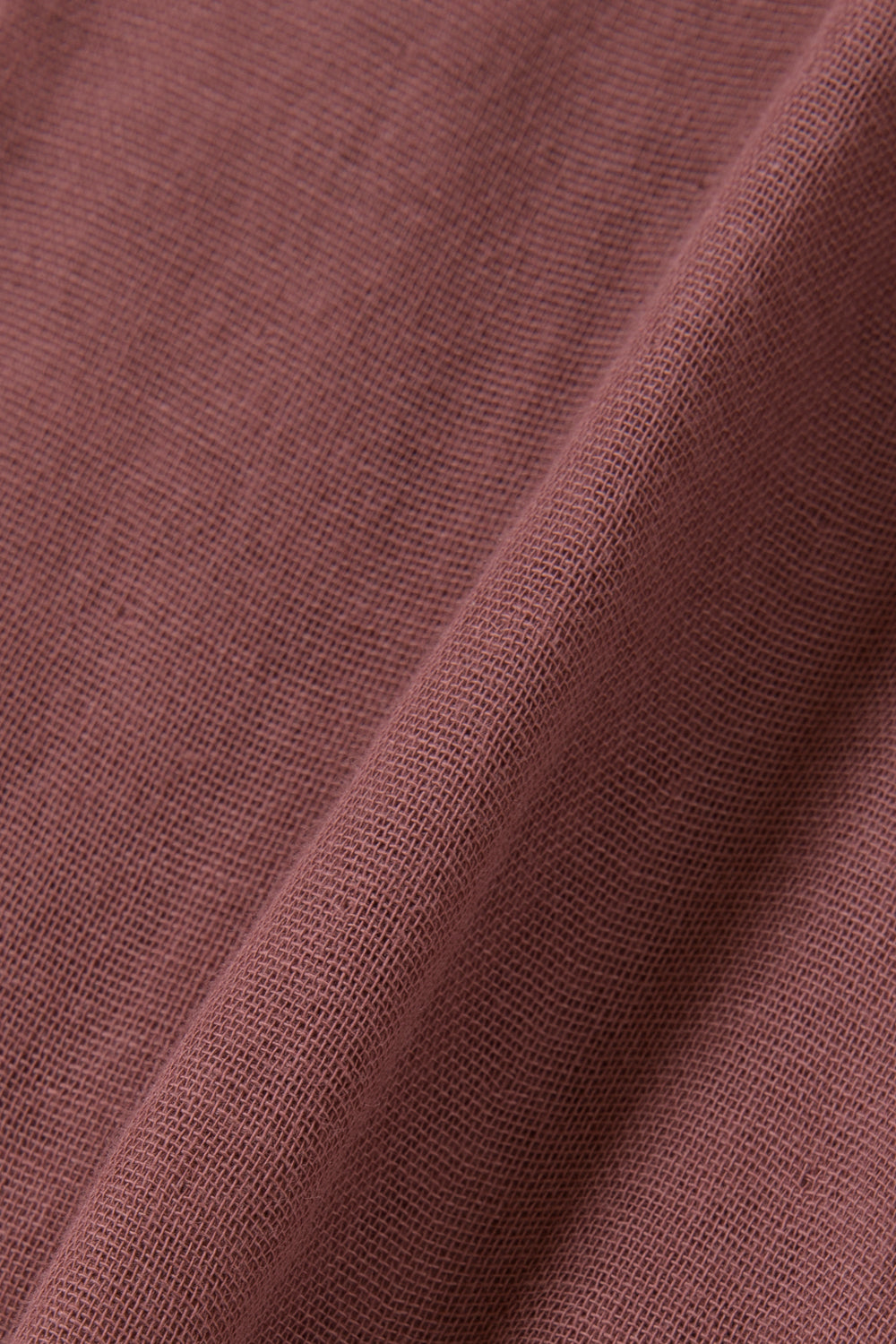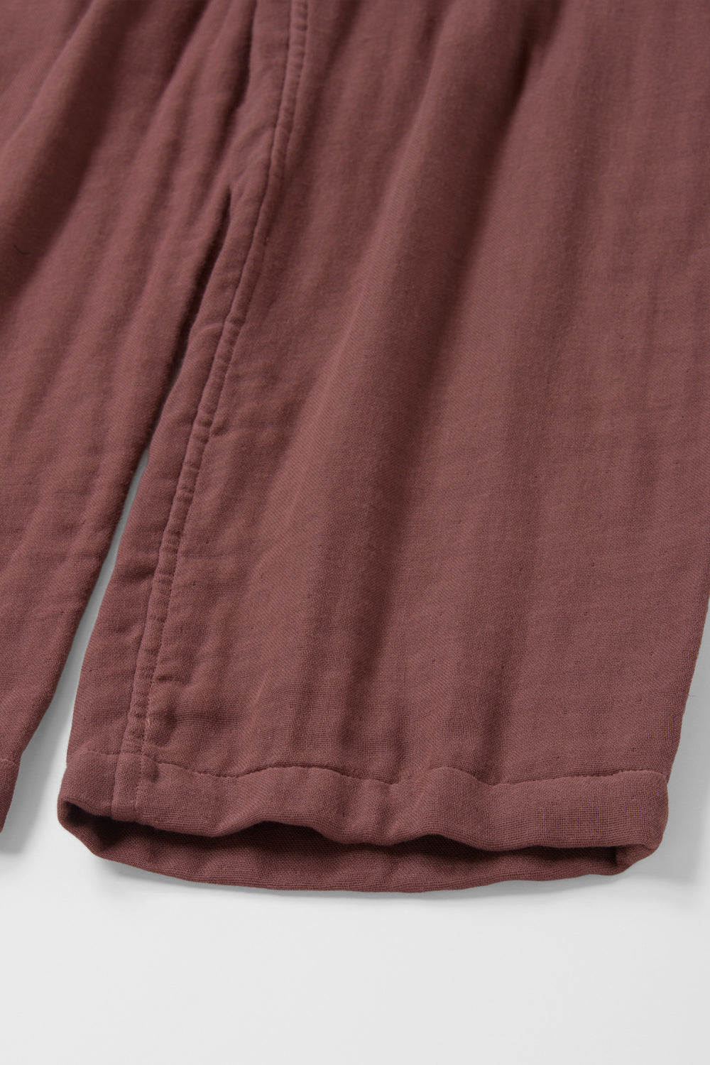 タテ糸に毛羽の少ないコンパクトヤーン、ヨコ糸にツヤのあるコーマ糸を使用。3重ガーゼのような軽やかさと、4重織ならではのあたたかさを兼ね備えた、やわらかで丈夫なガーゼ素材です。