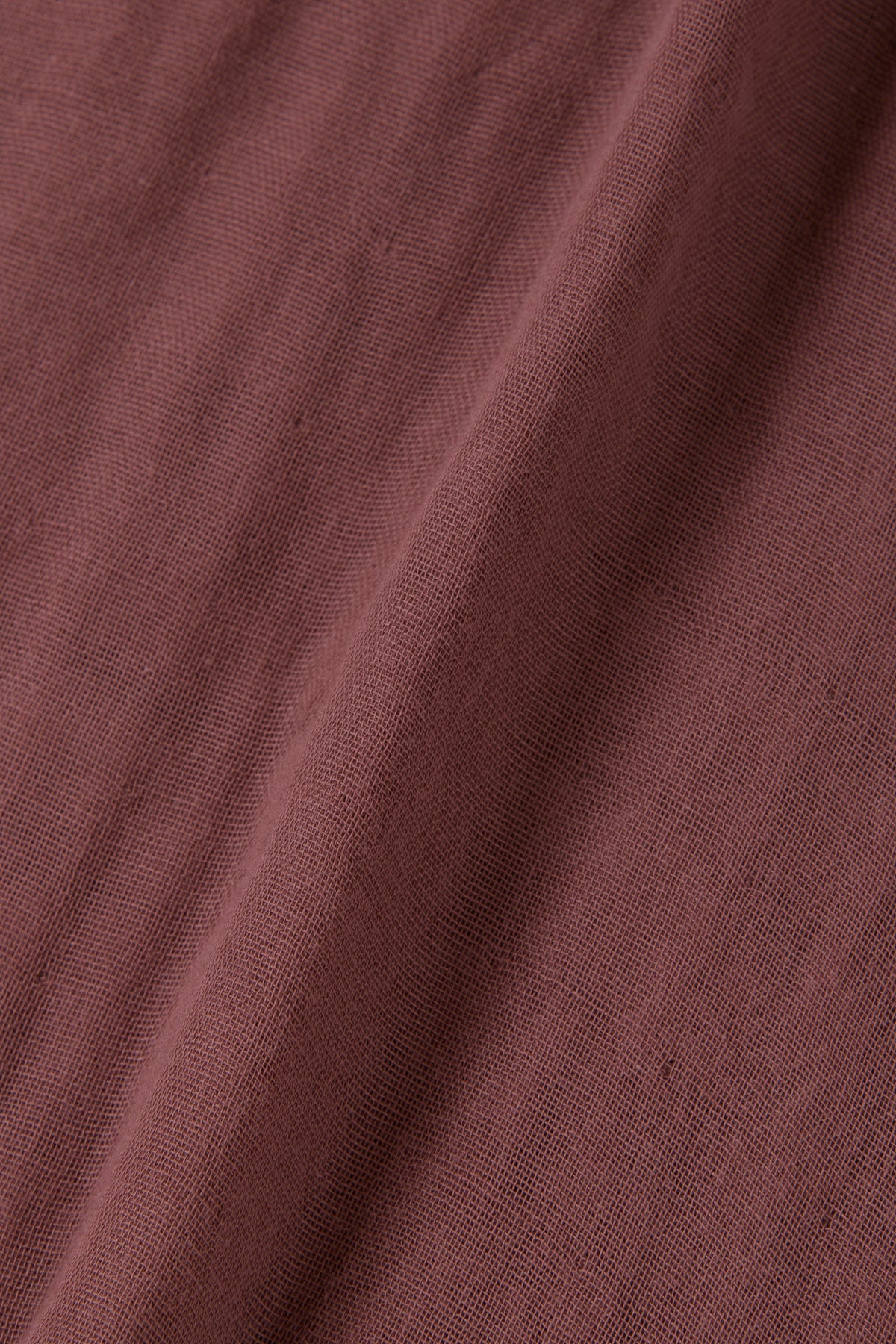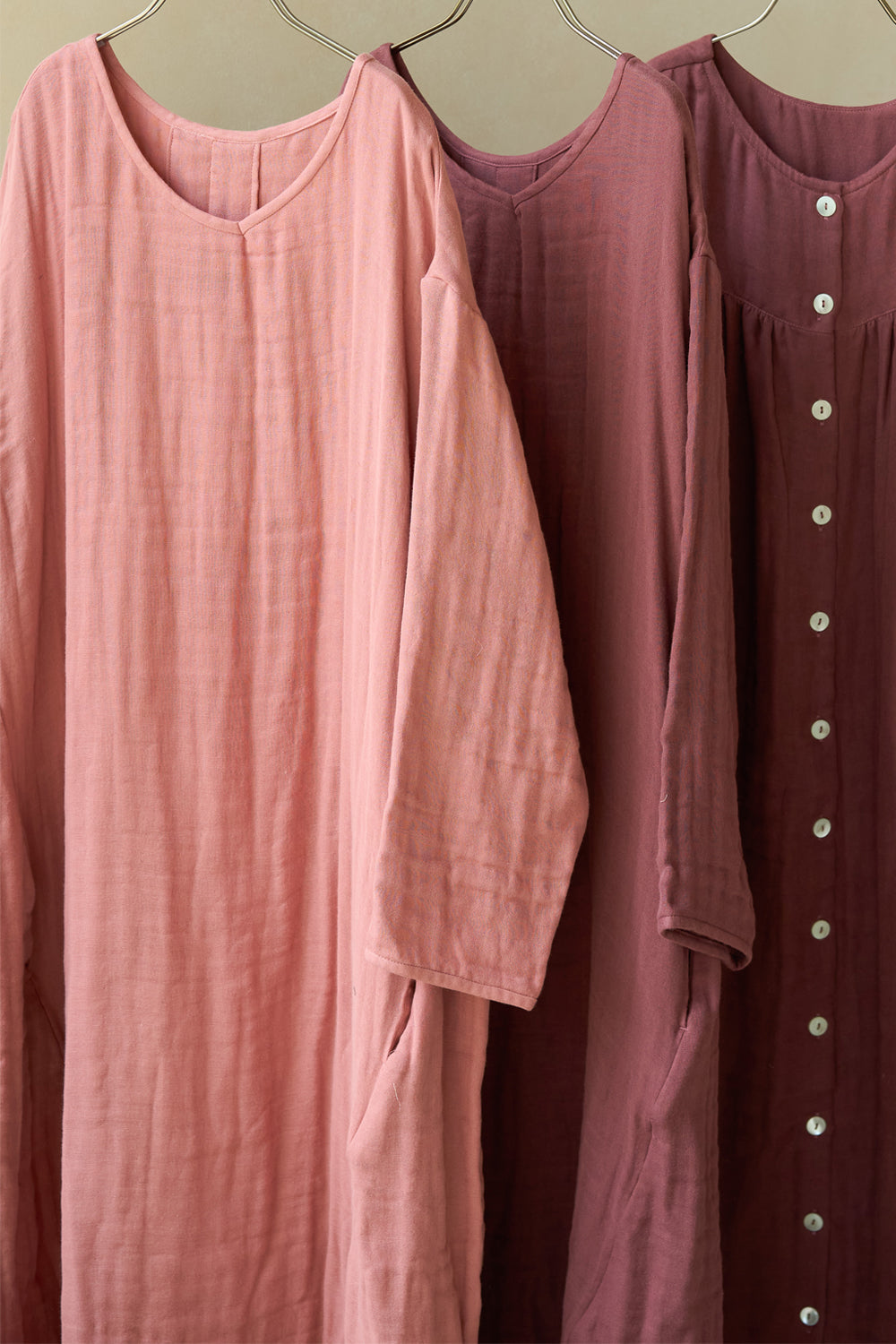タテ糸に毛羽の少ないコンパクトヤーン、ヨコ糸にツヤのあるコーマ糸を使用。3重ガーゼのような軽やかさと、4重織ならではのあたたかさを兼ね備えた、やわらかで丈夫なガーゼ素材です。
