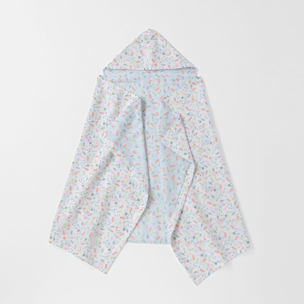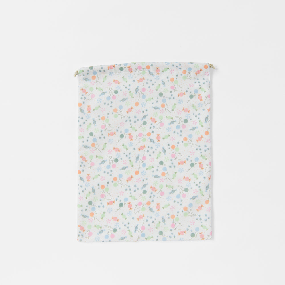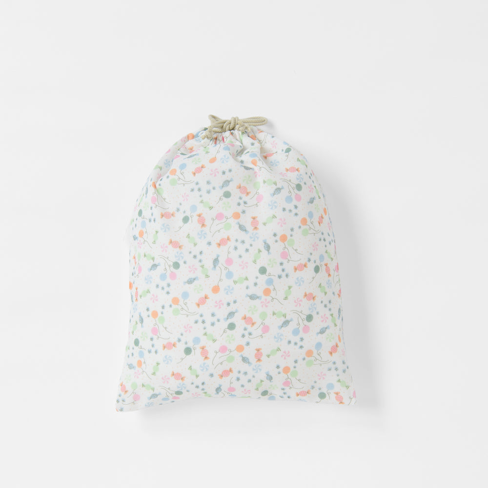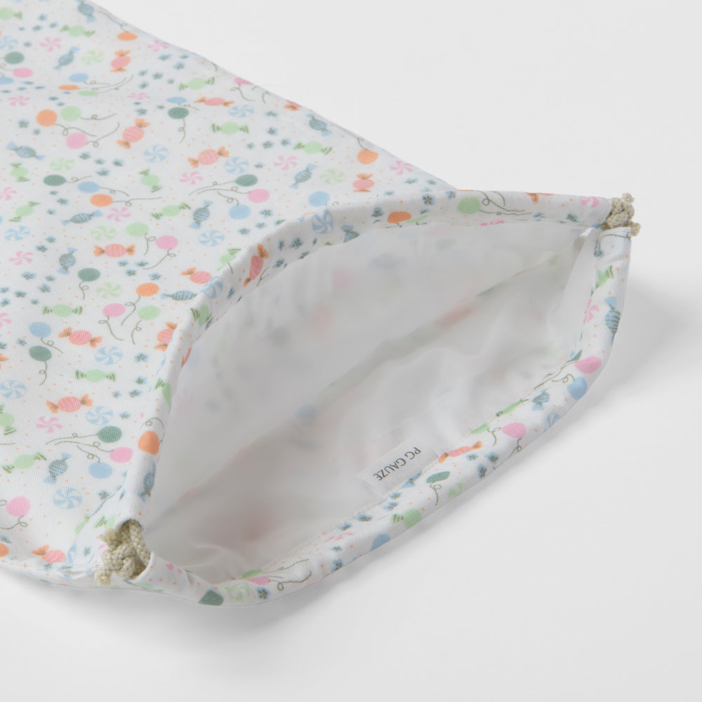 日差し除けにもなるフード付のガーゼタオルケットと絞り袋のセット。内側にポリエステル布をはった絞り袋はお着換え入れやお出かけの際の小物入れにも便利です。