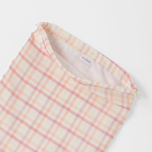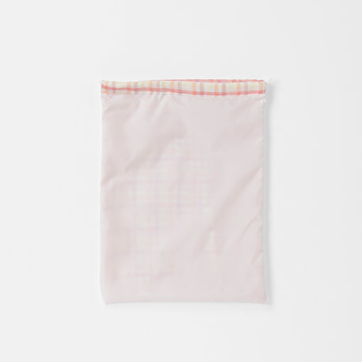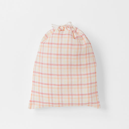 やわらかな肌触りの2重織ガーゼを使用し、内側には湿り気を通しにくいポリエステル布をはった絞り袋です。お着替え入れとしてはもちろん、旅行やお出かけ時の小物入れとしても便利。かさばらず、使わないときはコンパクトにたためるので持ち運びにも最適です。