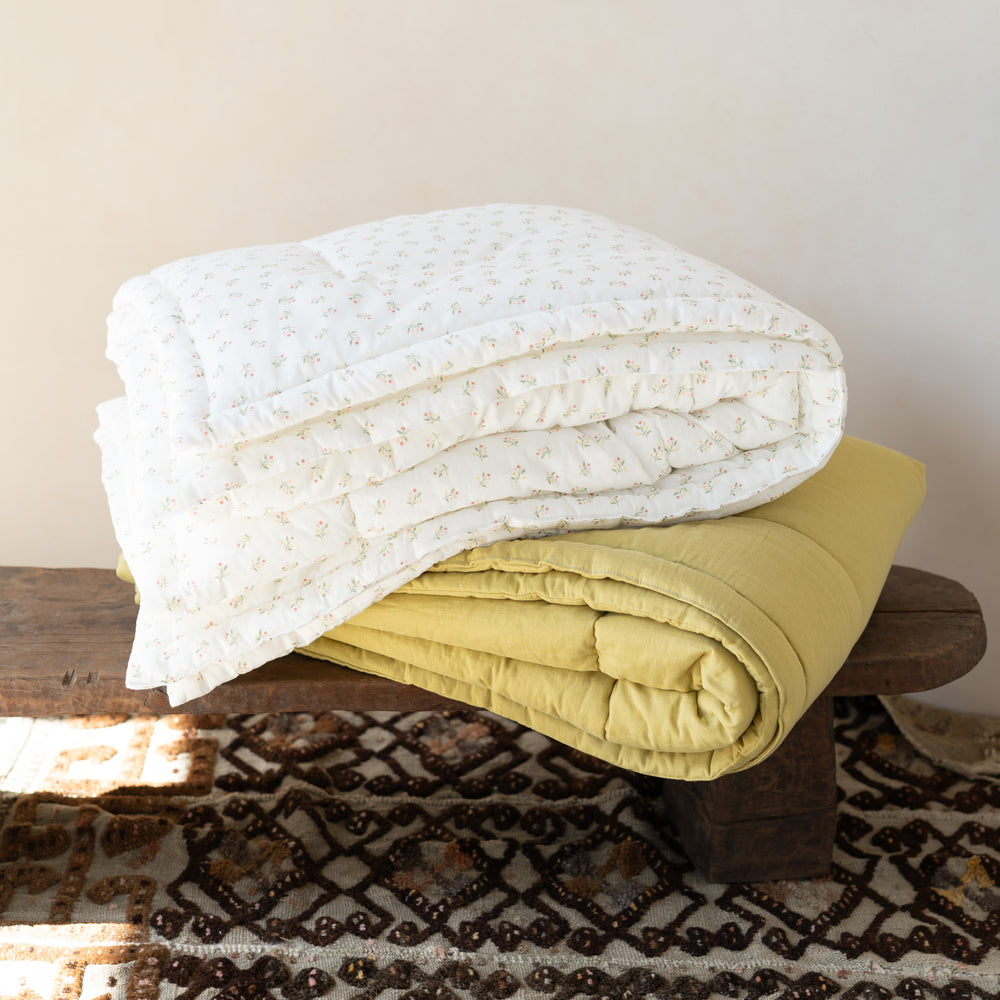 ごく薄い布状の綿をミルフィーユのように重ねて仕立てることで、ふんわりと軽く、空気をたっぷり含んだやわらかな仕上がりに。繰り返しの洗濯にも強く、乾きが早いため、毎日心地よくお使いいただけます。