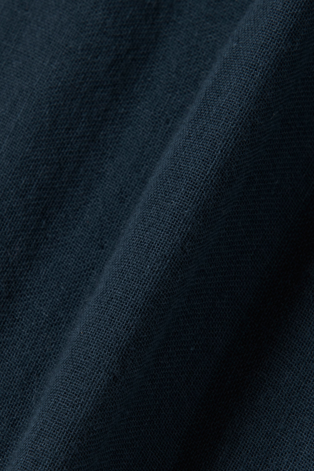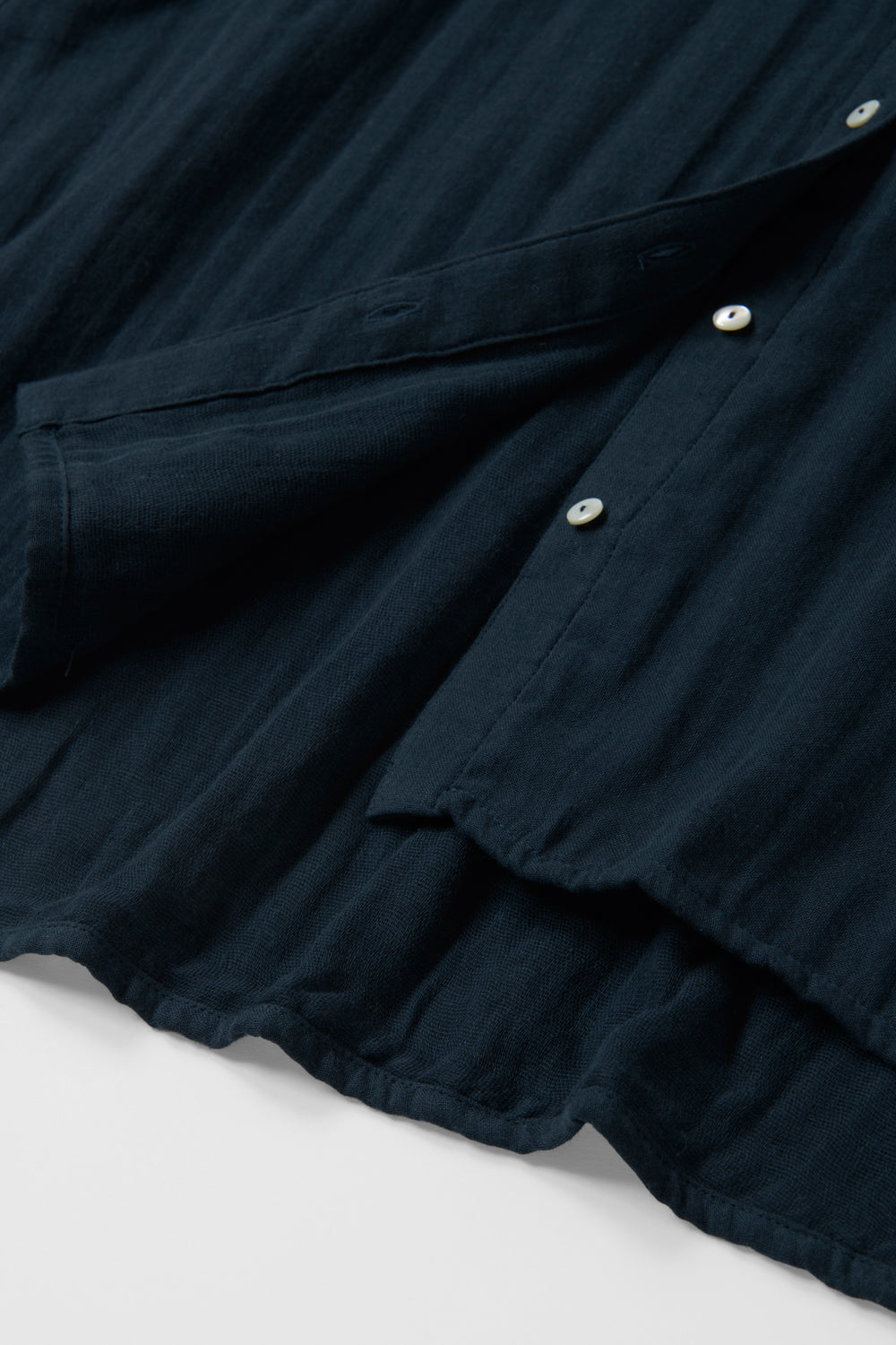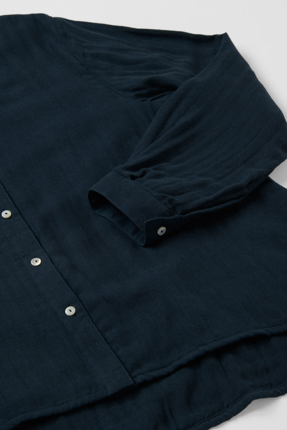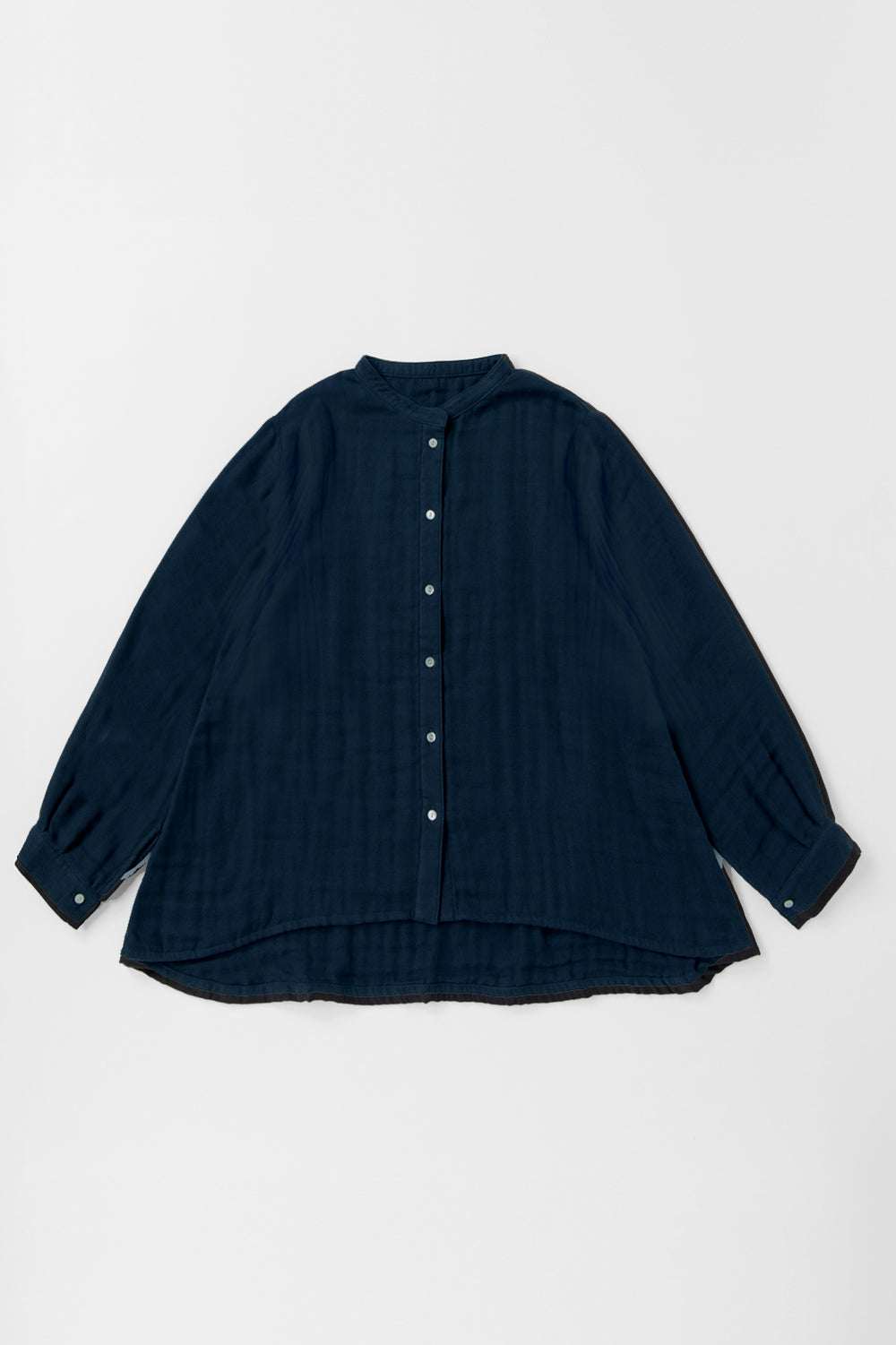ボックスシルエットで襟の折り返しがないすっきりとした首元のスタンドカラーシャツ。お部屋着としてはもちろん、ワンマイルウエアとしてもおすすめです。