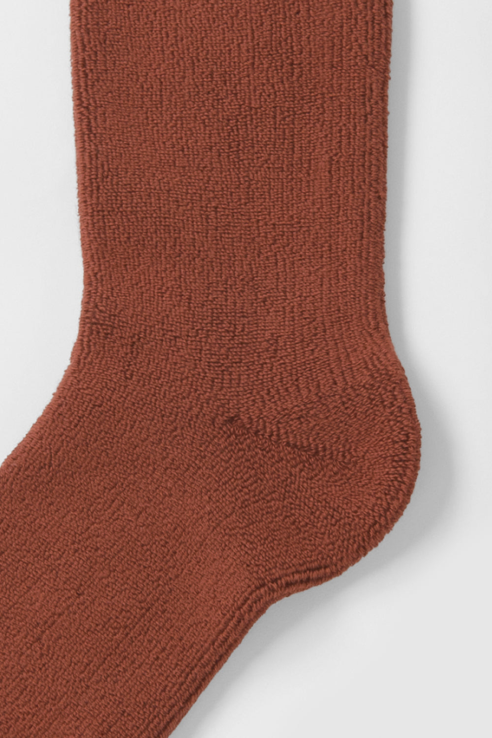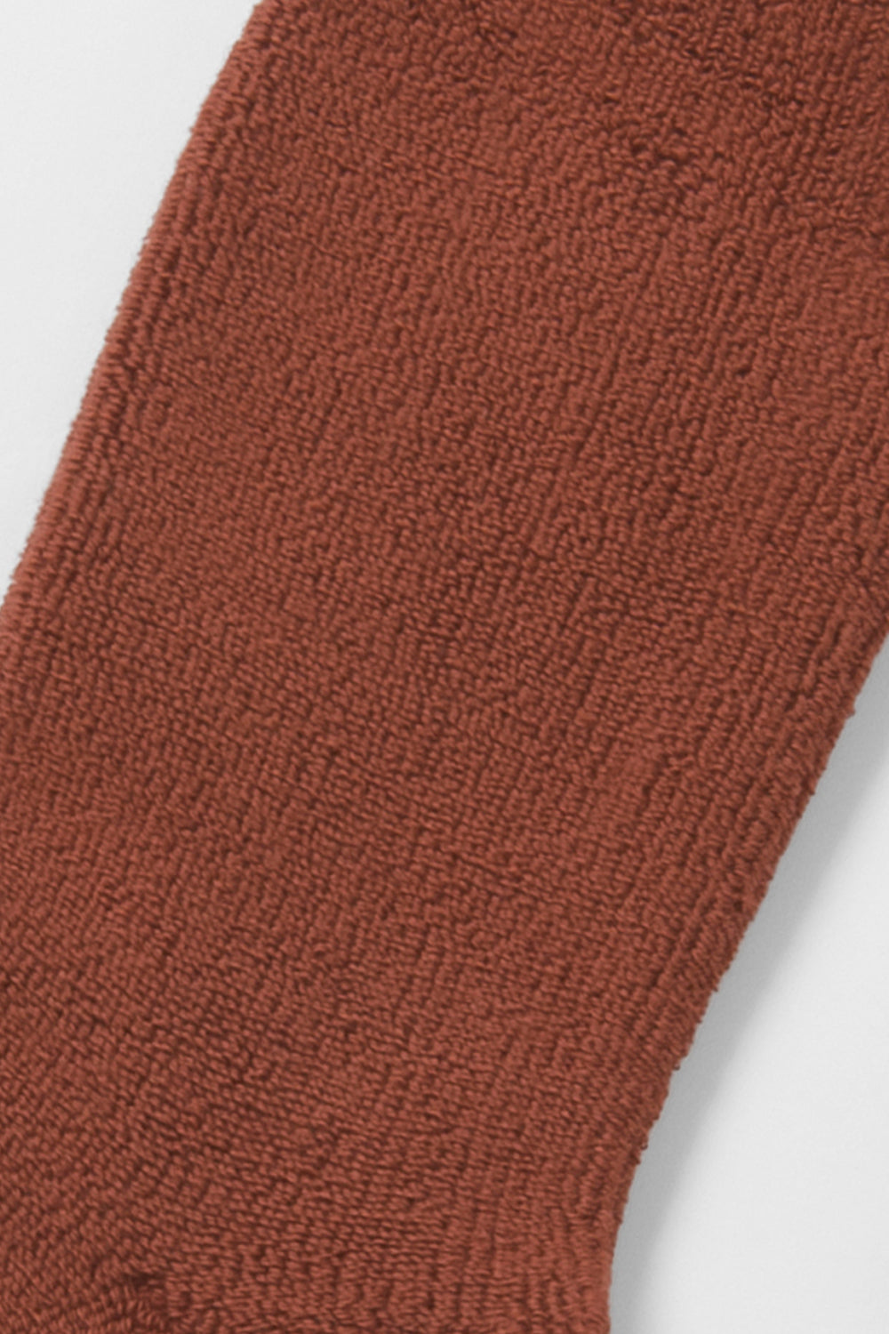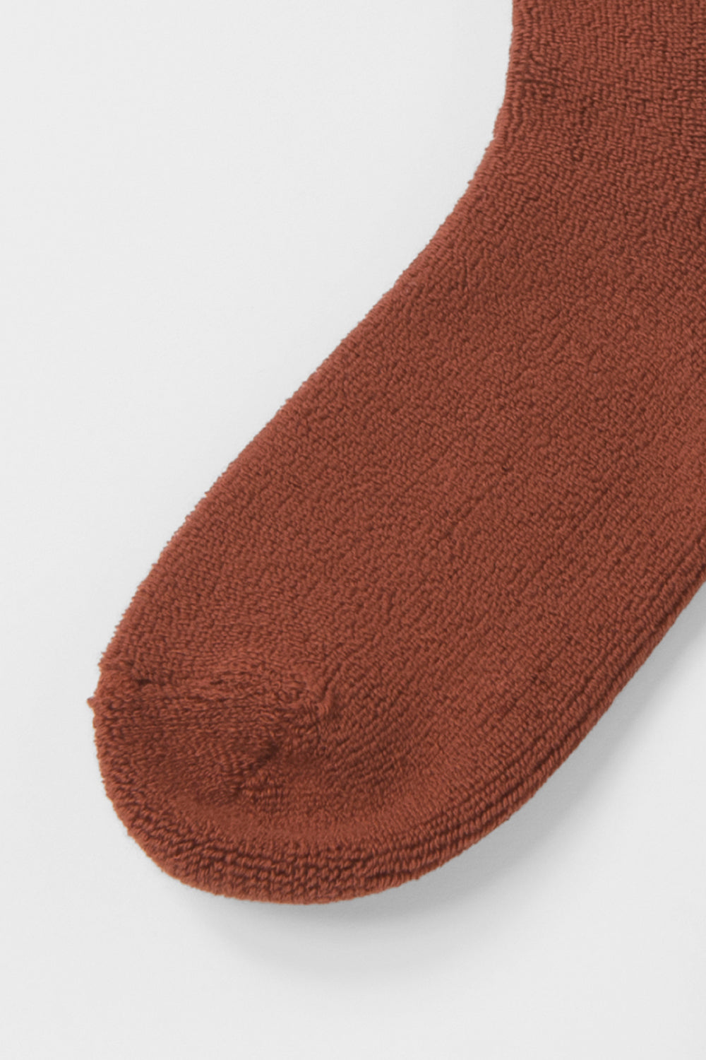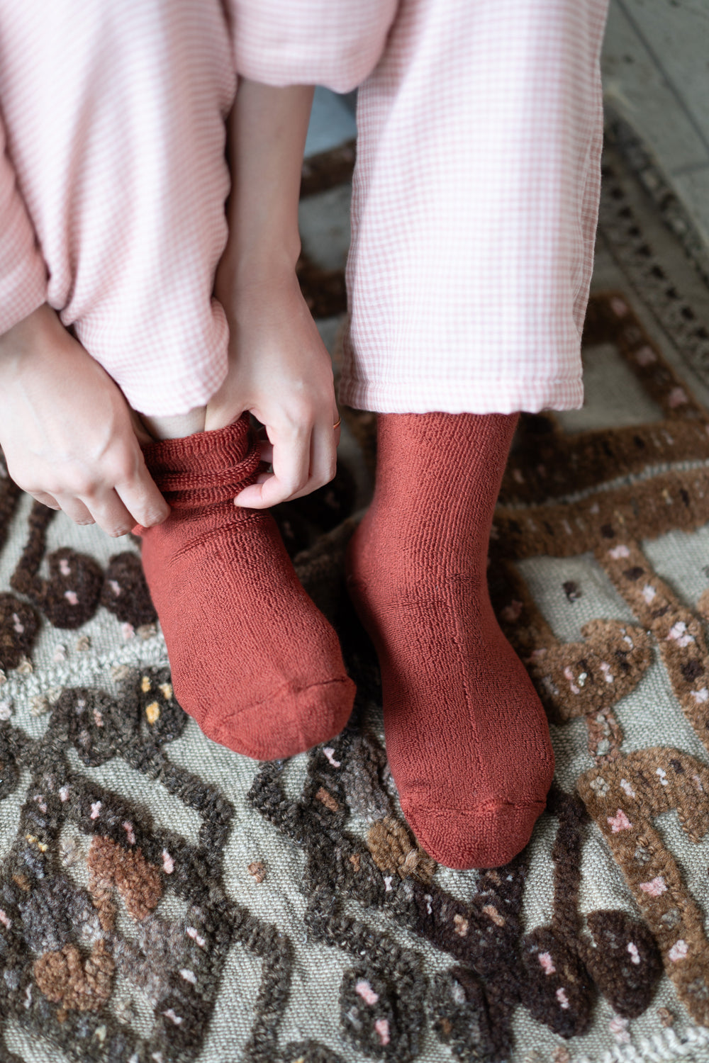 日本一の靴下産地・奈良県の広陵町で100年以上続く靴下工場さんで編み立てた表パイルの靴下。ピージーガーゼのプリント柄に合わせて糸から染色したオリジナルカラーです。肌に当たる部分は綿100%で、リバーシブルで使用できます。