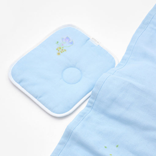 布団カバーの内側にある4か所の紐でお布団を留めるので、中のお布団がずれる心配がありません。 薄綿入りの平らな枕はまだ首がすわっていない赤ちゃんの頭をやさしく支え、寝汗をしっかり吸収します。