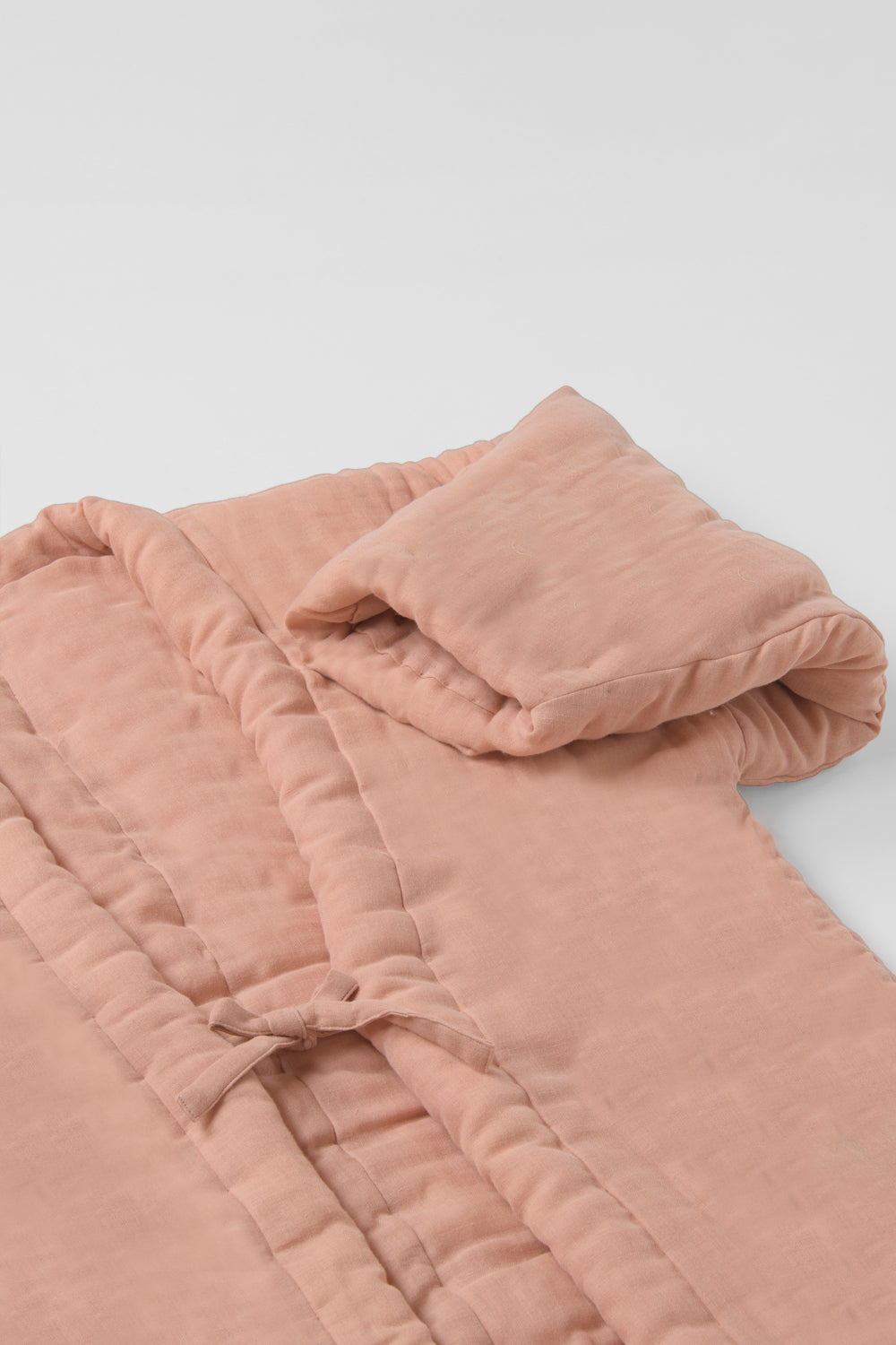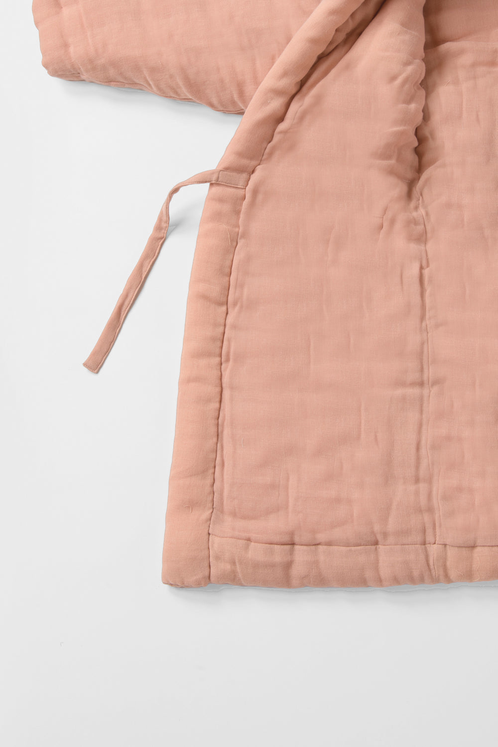 一般的な半纏が厚く丈夫な綿生地を使うのに対し、ピージーガーゼの半纏は綿をガーゼで包むことで、ふんわりとした肌触りに。