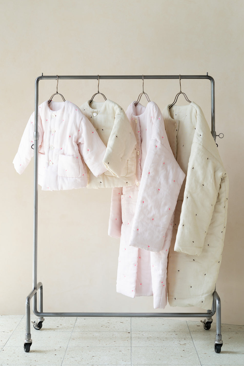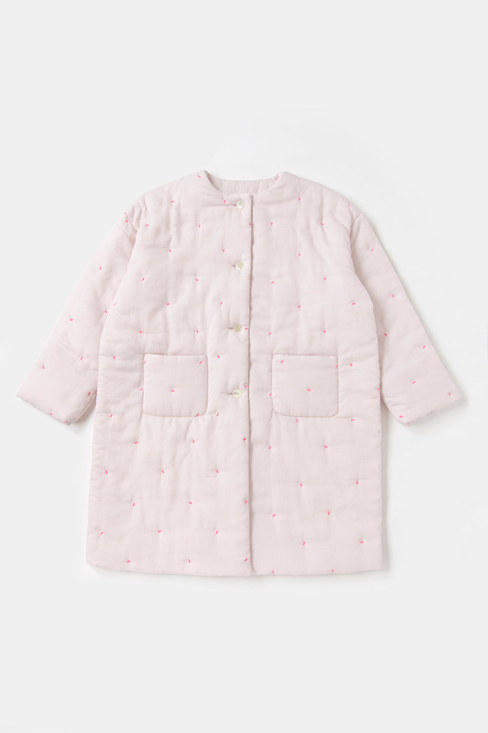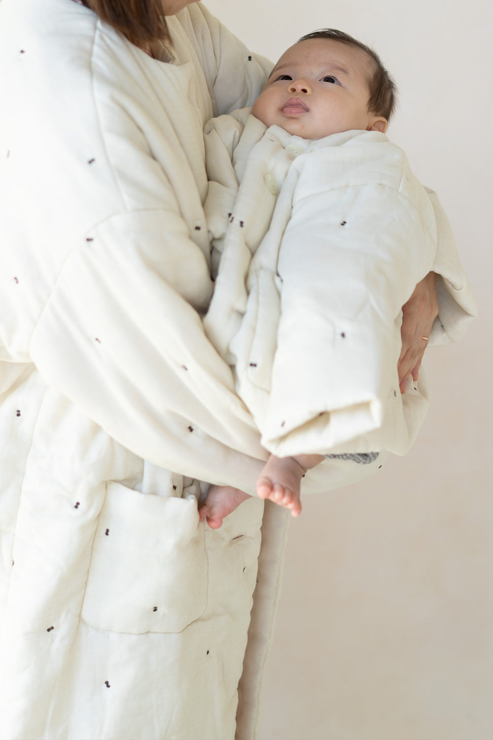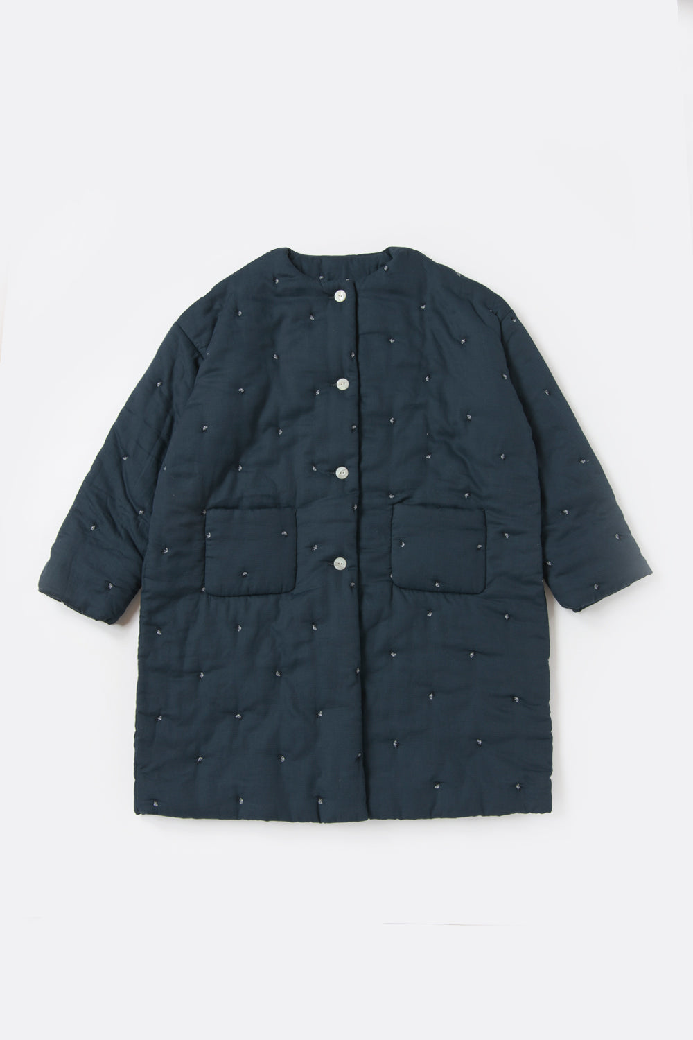 軽くて丈夫なドビー織りのガーゼに刺繍をあしらい、綿を入れて仕立てた「綿入りガーゼはおり」。