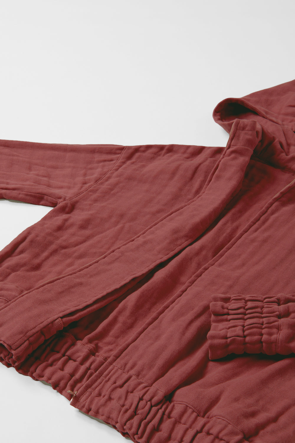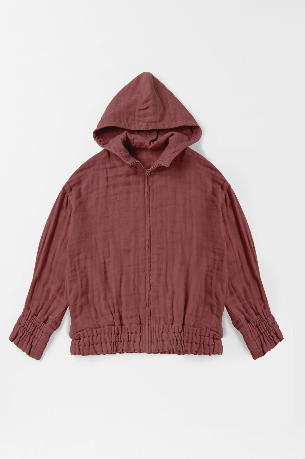 手元に数本のゴムを入れてやさしく絞った、肌触りのやわらかなガーゼパーカー。首元まで上げられるハイネック仕様のジップデザインで、日差しや肌寒さをさりげなく防ぎます。ちょっとした外出はもちろん、お部屋着や羽織としても活躍します。