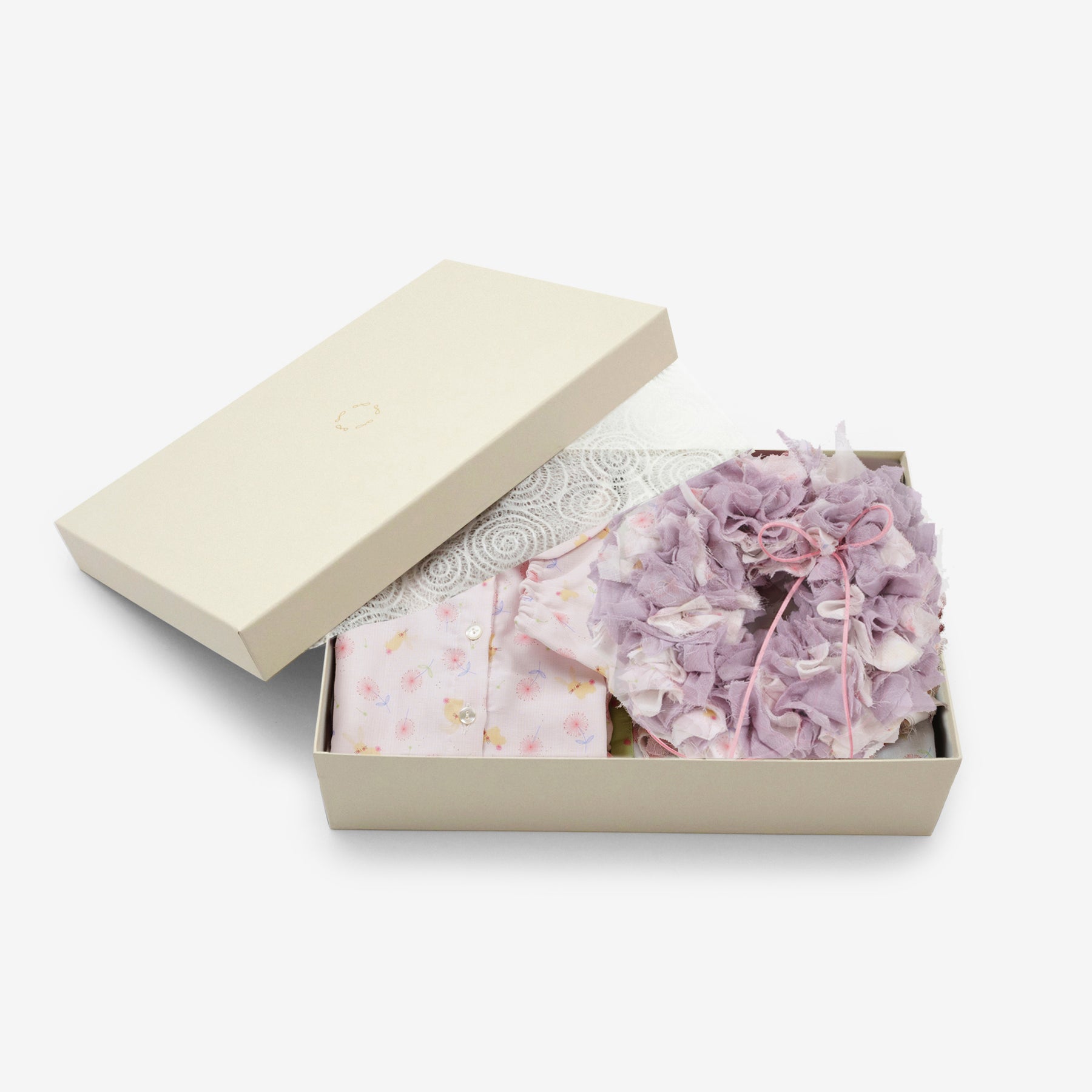 キッズパジャマと人気のフード付タオルケット、そして可愛らしいガーゼリースをセットにしたギフトセット。
