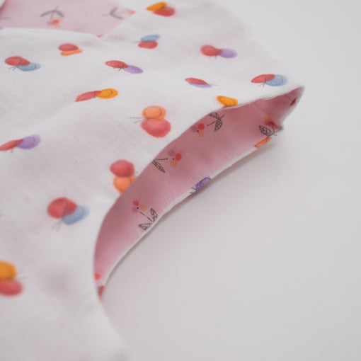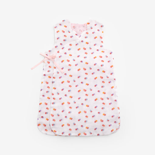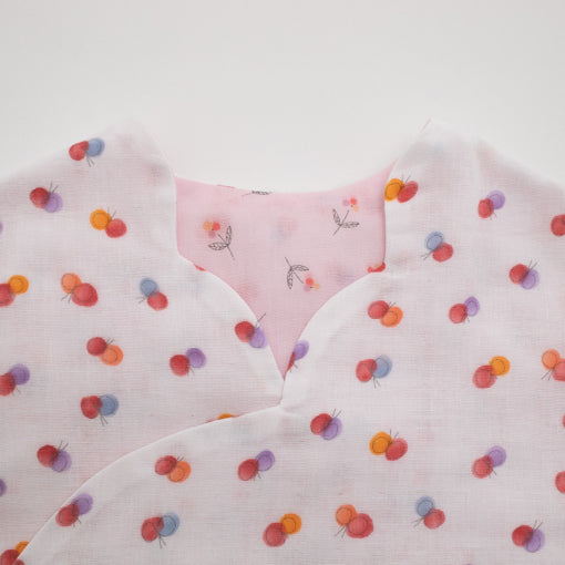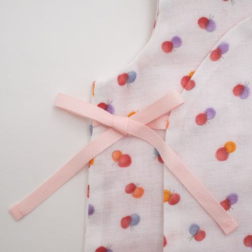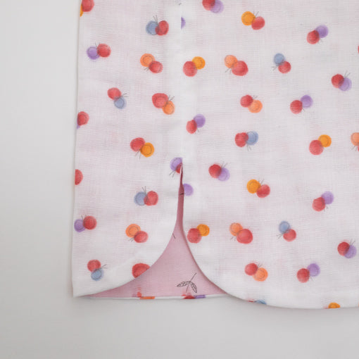 This is a gauze jacket that can be layered over rompers or pajamas. At a young age, it has a long length, so it wraps around the legs, and as children grow older, many people use it as a tunic-length vest.The rounded collar and slit give it a soft appearance, making it a popular item that has remained unchanged for 20 years. The two pieces of the body are sewn together on the outside, and the skin side ends flat. It has a four-layer construction made of two layers of double-woven gauze that is wrinkle-resistant and feels good on the skin, so it can be used like a cardigan during the changing seasons. |