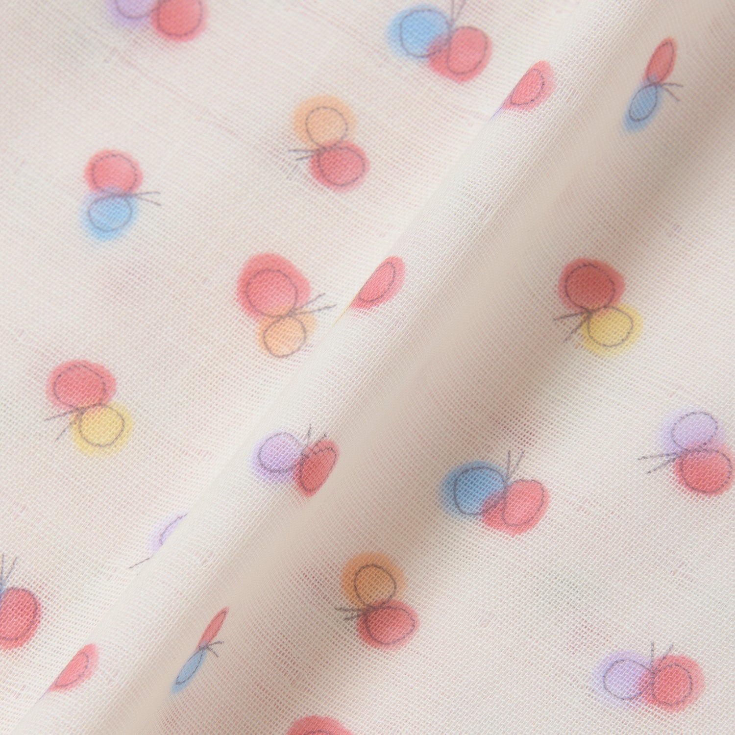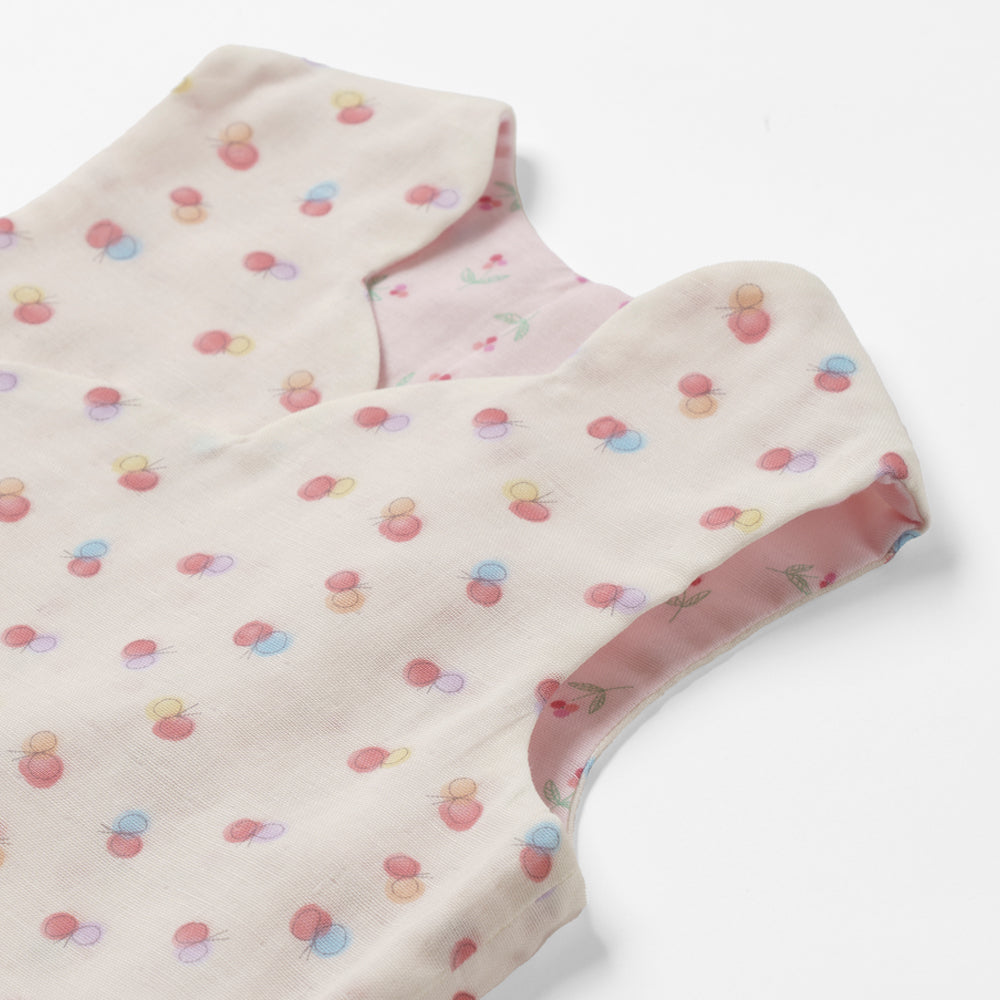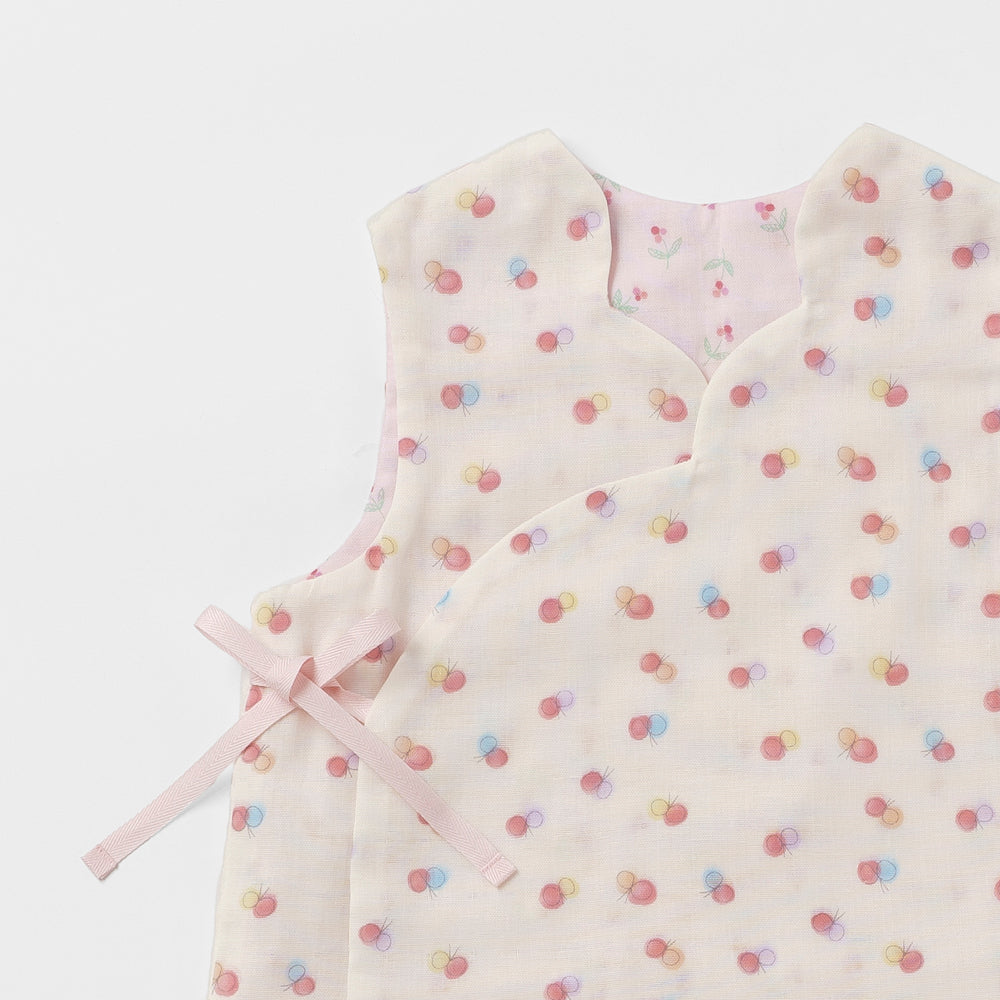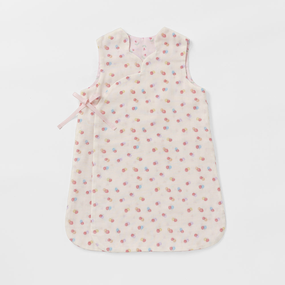 This is a gauze jacket that can be layered over rompers or pajamas. At a young age, it has a long length, so it wraps around the legs, and as children grow older, many people use it as a tunic-length vest.The rounded collar and slit give it a soft appearance, making it a popular item that has remained unchanged for 20 years. The two pieces of the body are sewn together on the outside, and the skin side ends flat. It has a four-layer construction made of two layers of double-woven gauze that is wrinkle-resistant and feels good on the skin, so it can be used like a cardigan during the changing seasons. |