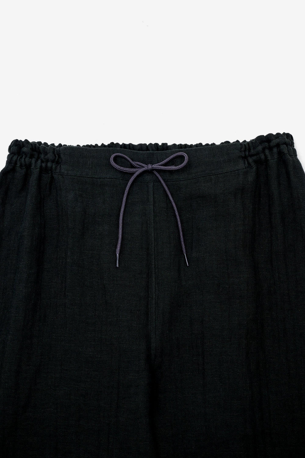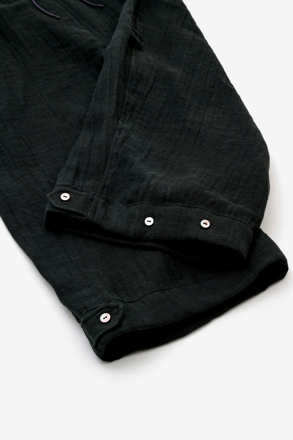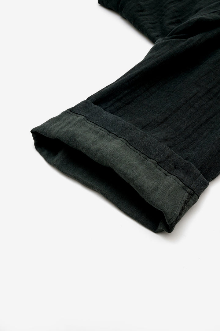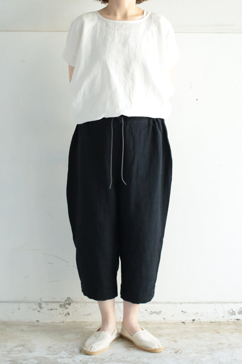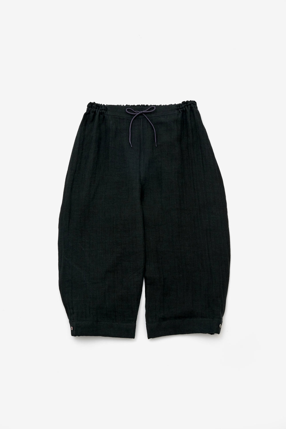 足元に貝ボタンが付いたガーゼハーフパンツ。 足元のボタンでシルエットの調節が可能で、リラックス着としても外出着としても着ていただけます。丈が短く身長の低めの方にもおすすめです。ガーゼのやわらかさはを残しつつ透けが少なくお部屋着や外出着として通年使用できるため、贈り物としても人気の商品です。