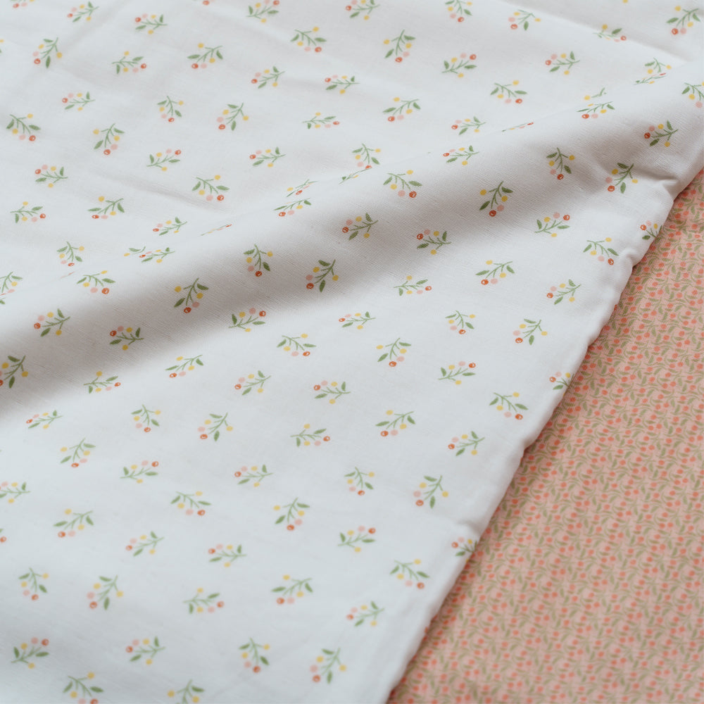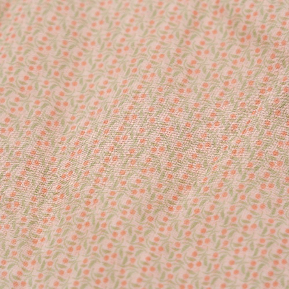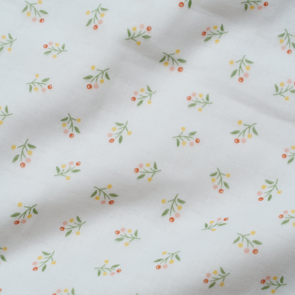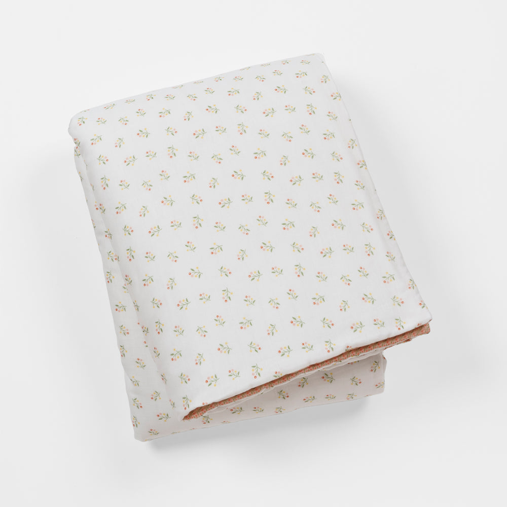 表地は和歌山県でプリントした綿100%2重織ガーゼ。洗うたびにやわらかく肌になじみます。中綿は極細繊維のポリエステル綿を使用。また、ポリエステル綿とガーゼ生地の間に丈夫でしっとりとした不織布を挟んでいます。吸水性が高く乾きが早いため、毎日の日常使いにおすすめです。