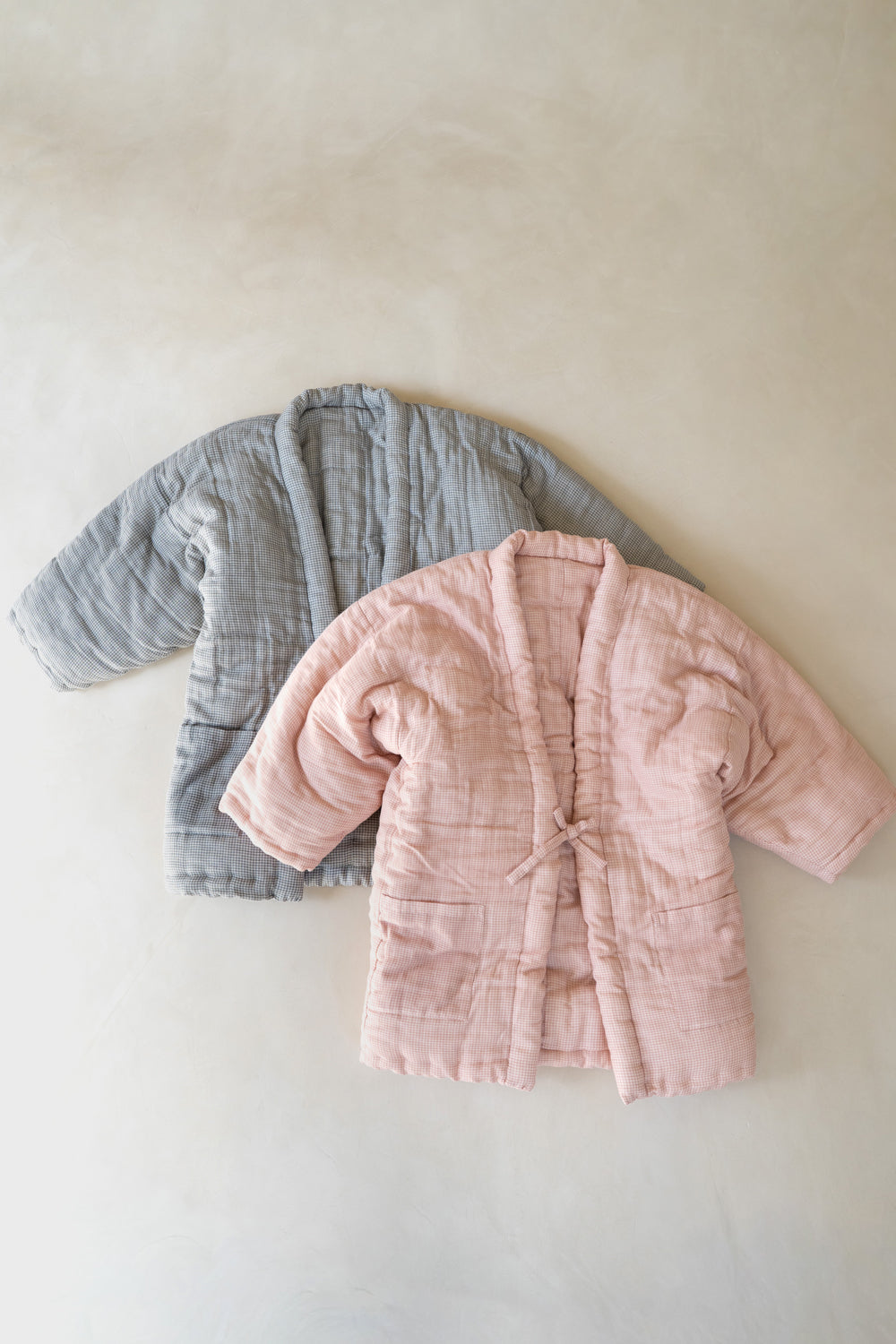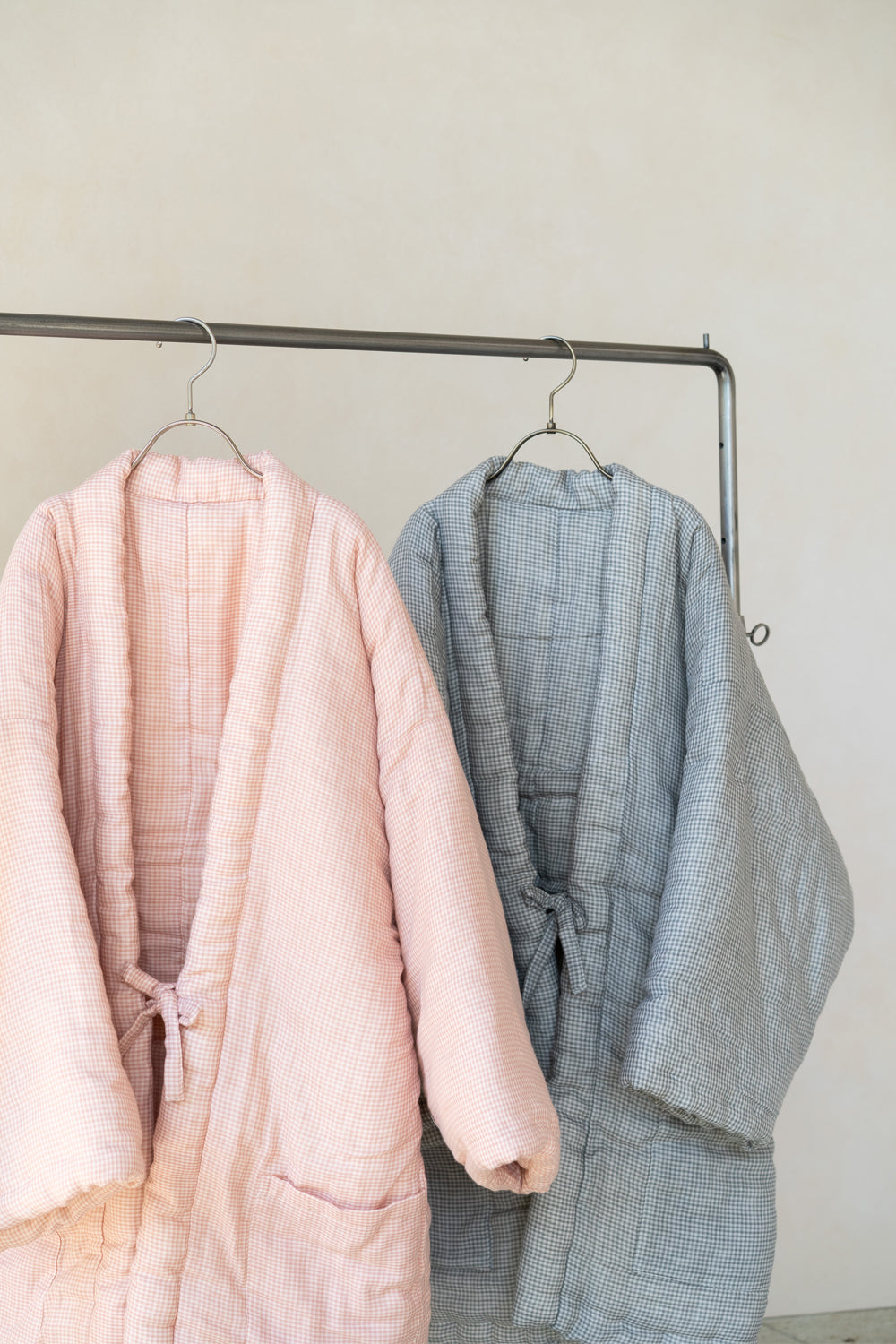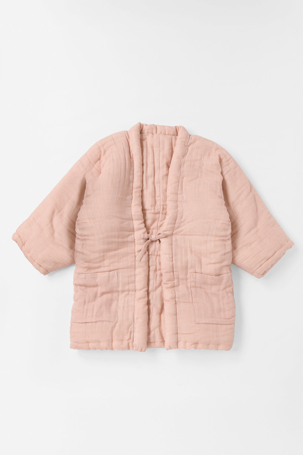 一般的な半纏が厚く丈夫な綿生地を使うのに対し、ピージーガーゼの半纏は綿をガーゼで包むことで、ふんわりとした肌触りに。