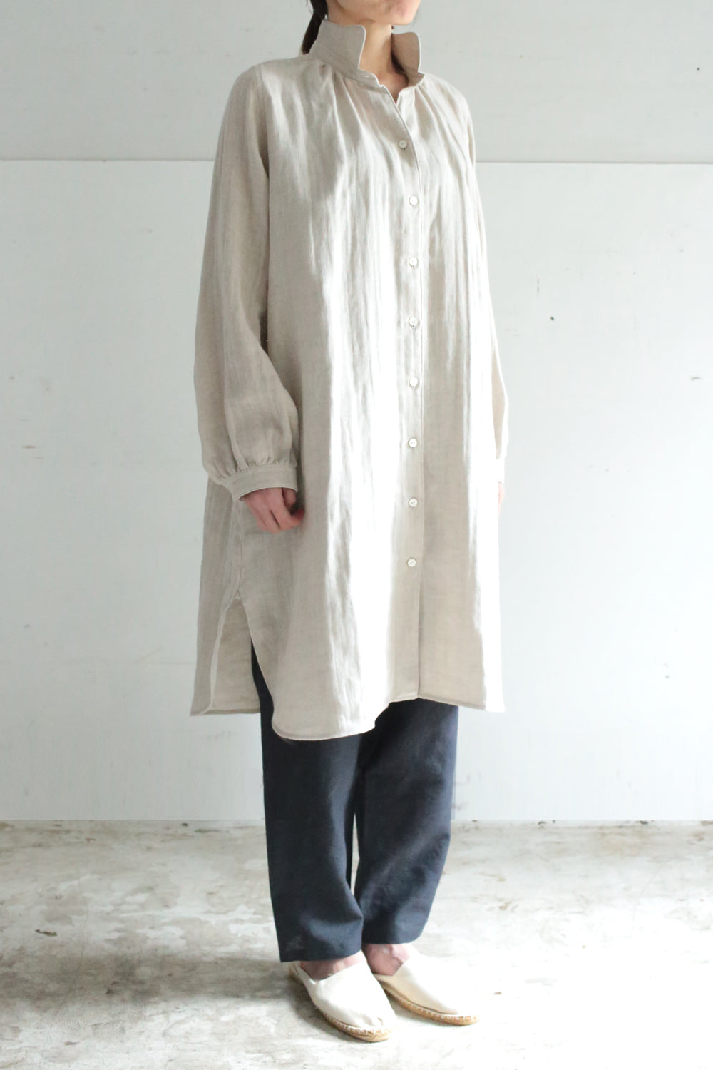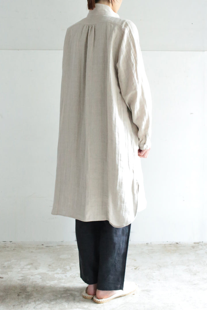 着心地はガーゼのやわらかさを残しつつ麻の光沢感で普段着として使いやすい透けの少ない素材です。