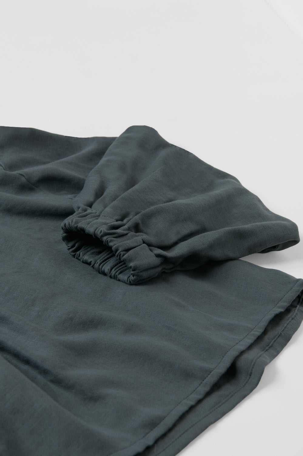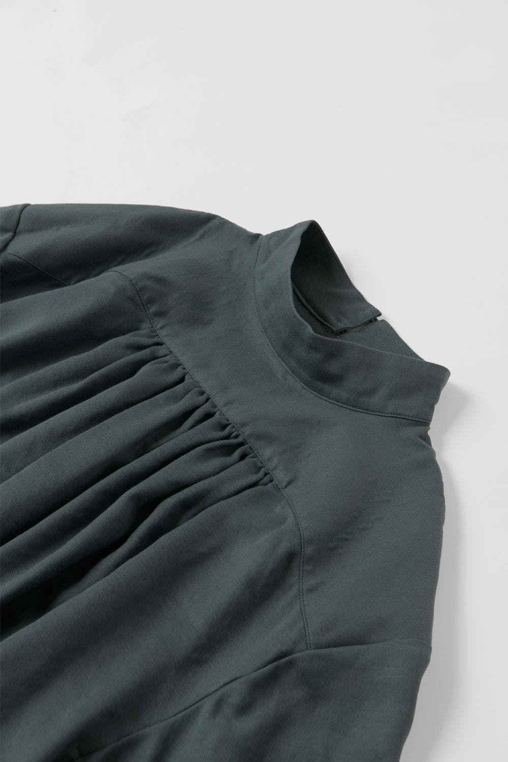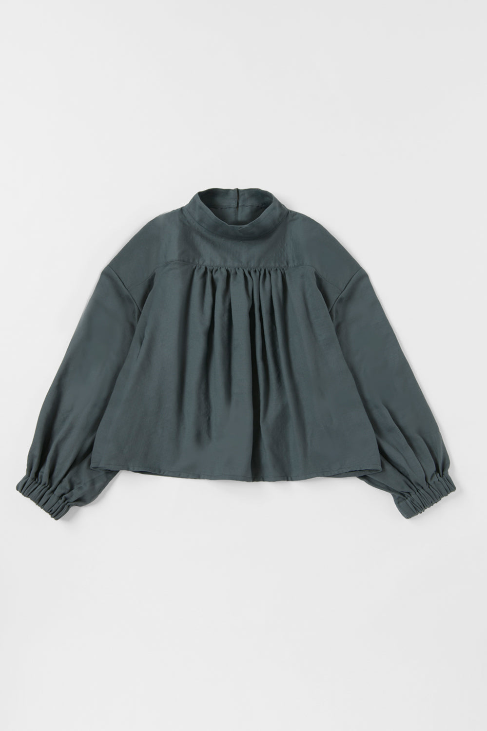 一枚で華やかなパフスリーブブラウス。ギャザーが多くゆったりとしたデザインながら顔周りはスタンドカラーですっきりとした印象に。身幅が広いので妊娠中の方にもおすすめです。軽くやわらかな素材で、ブラウスとしてはもちろん、ニットの下に重ね着すれば首まわりのちくちく感をカバーします。