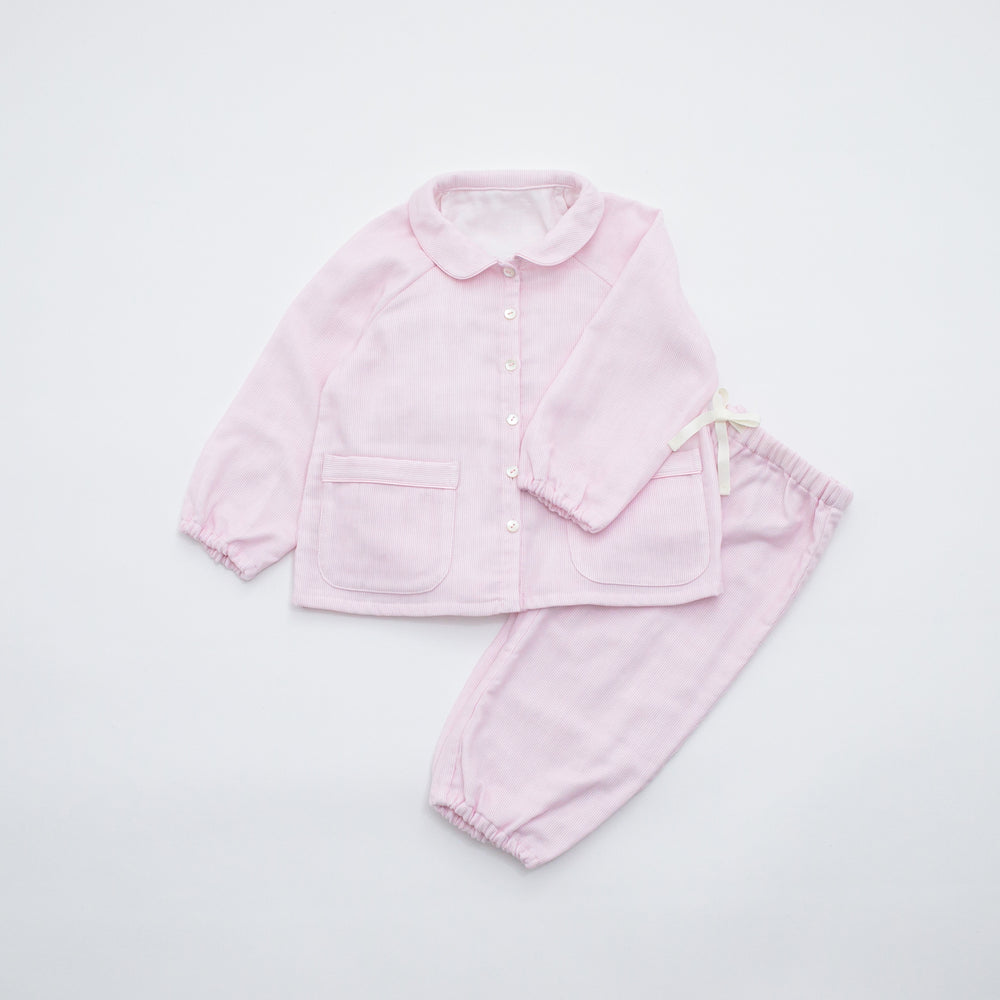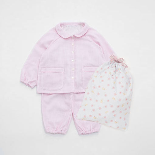 やわらかく丈夫であたたかい3重織ガーゼのキッズパジャマと、持ち運びに便利な絞り袋のセット。